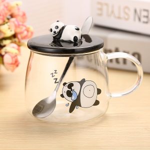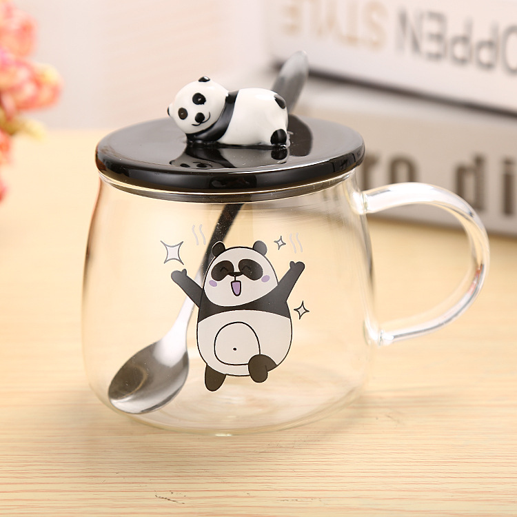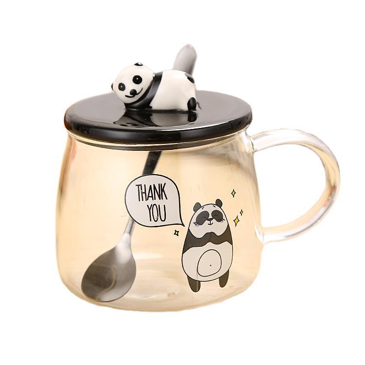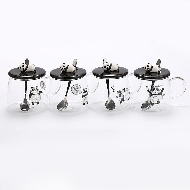Revo ceramic panda glass cup with 3D panda lid water cup high borosilicate resistant glass cup student gift cup